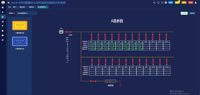 1)配電監測可以通過一次圖形式幫助用戶了解每一個機柜的運行情況,數據實時刷新。