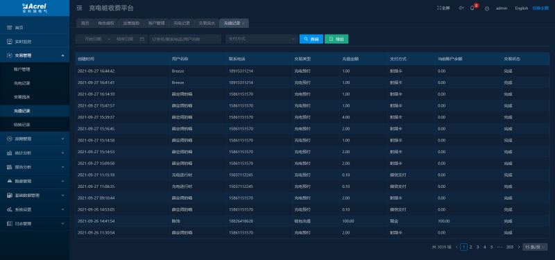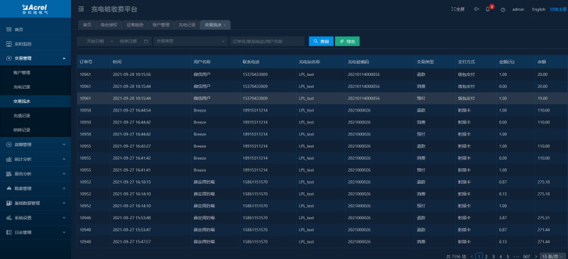 顯示所有訂單數據,可以對訂單按照充電站、充電樁、支付方式、交易狀態等進行分類查詢,可對充電中的充電樁進行停止充電操作。