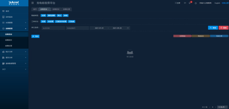 顯示充電樁的故障信息及處理進度,故障類型包括過壓、欠壓、空載、絕緣檢測故障、漏電、過溫、短路等。
