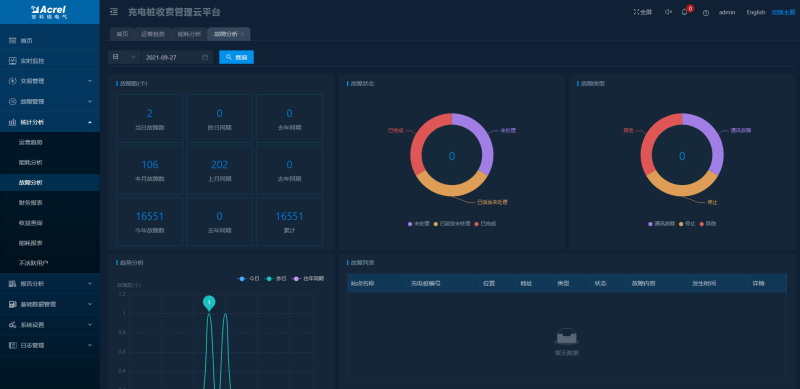 可查看相關時間內的故障數、故障狀態、故障類型、趨勢分析及故障列表。