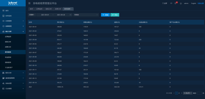 可根據時間查看關聯站點的財務數據,包括預付金額、消費金額、退款金額、充值金額、賬戶余額等,可導出成excel表格。