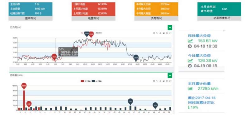 平臺(tái)首頁(yè)可顯示:主變臺(tái)數(shù)、主變?nèi)萘俊⒈O(jiān)測(cè)分路個(gè)數(shù);當(dāng)日累計(jì)電量、本月累計(jì)電量、上月總電 量;負(fù)荷概況:本月負(fù)荷、本年負(fù)荷、本月需量負(fù)荷;月度功率因素、用電異常預(yù)警事件數(shù); 界面中部顯示昨日和今日的日負(fù)荷曲線。