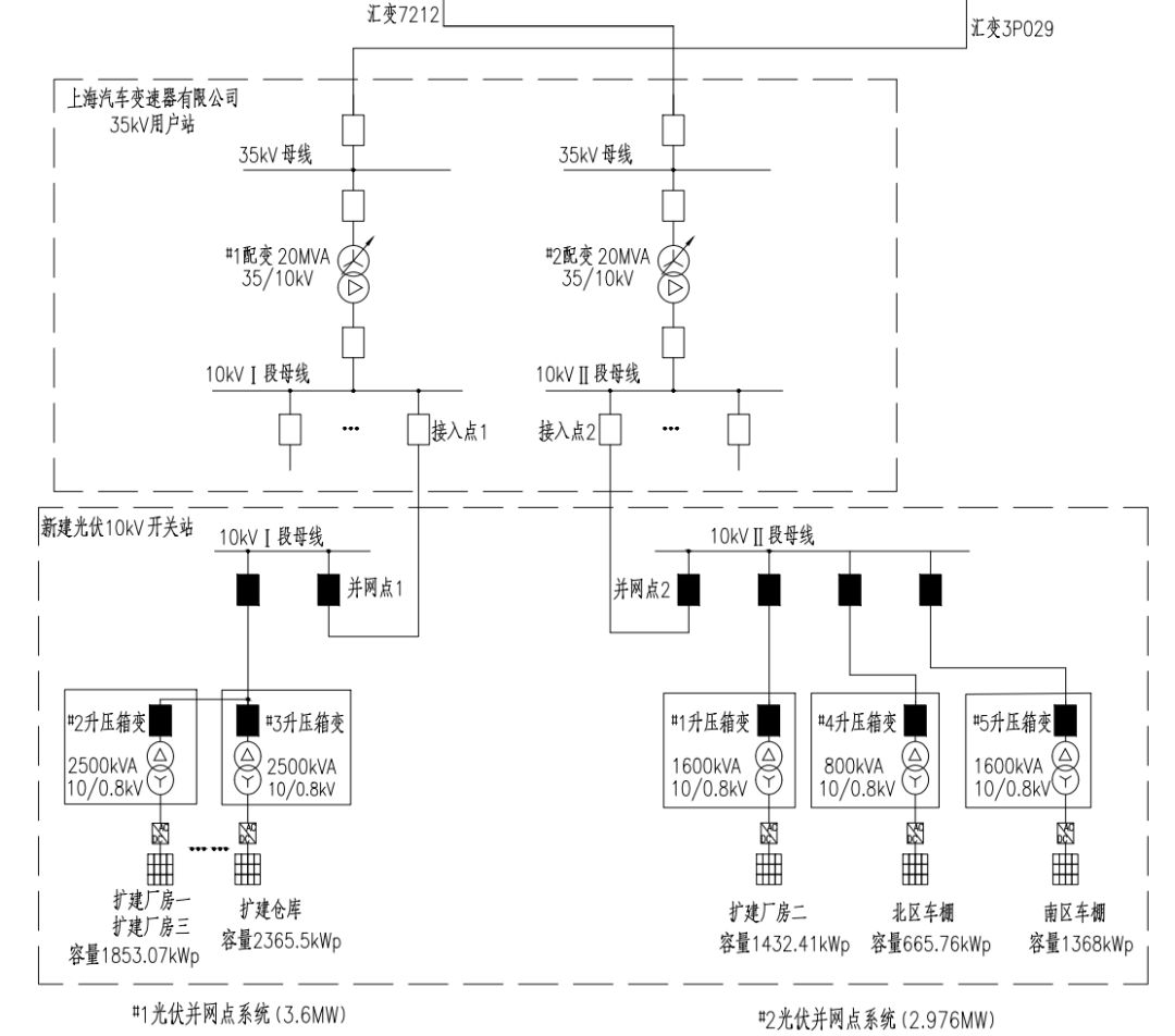 上海汽車變速器有限公司屋頂光伏發(fā)電項目(以下簡稱“本項目”),位于上海市嘉定區(qū),裝機(jī)容量為8.3MW,采用自發(fā)自用余電上網(wǎng)模式。本項目現(xiàn)役35kV用戶站1座,站內(nèi)2臺35kV主變,容量均為20MVA。本次光伏設(shè)計2個并網(wǎng)點,新建一座10kV開關(guān)站,光伏組件逆變?yōu)?.8kV交流電壓,經(jīng)升壓后2個并網(wǎng)點以10kV電壓等級分別接入35kV用戶站的10kVⅠ段母線、Ⅱ段母線,并網(wǎng)點容量分別為3.6MW、2.976MW。