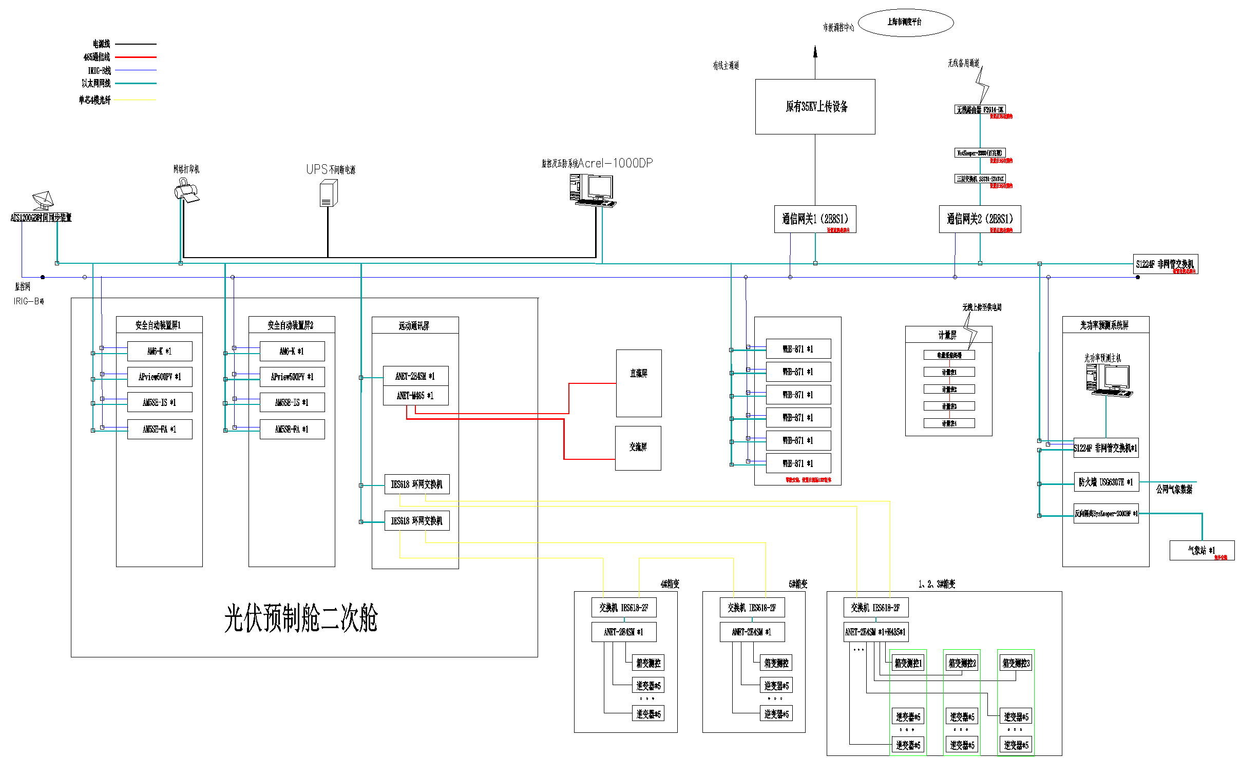 光伏電站中5臺箱變之間通過光纖環(huán)網(wǎng),保證數(shù)據(jù)長距離的穩(wěn)定傳輸,通過通信管理機(jī)及網(wǎng)絡(luò)交換機(jī)實時采集微機(jī)保護(hù)裝置、電能質(zhì)量在線監(jiān)測裝置、計量、遠(yuǎn)動系統(tǒng)等二次設(shè)備數(shù)據(jù),實現(xiàn)光伏發(fā)電系統(tǒng)監(jiān)控與自動化管理;同時,配置對時裝置、遠(yuǎn)動裝置滿足系統(tǒng)與上級調(diào)度的需求,配置一套一體化電源系統(tǒng),為二次設(shè)備及監(jiān)控主機(jī)等重要設(shè)備運行提供穩(wěn)定可靠的電源,實現(xiàn)整個光伏系統(tǒng)的安全、穩(wěn)定運行。
