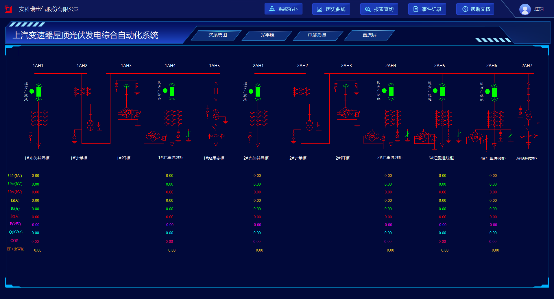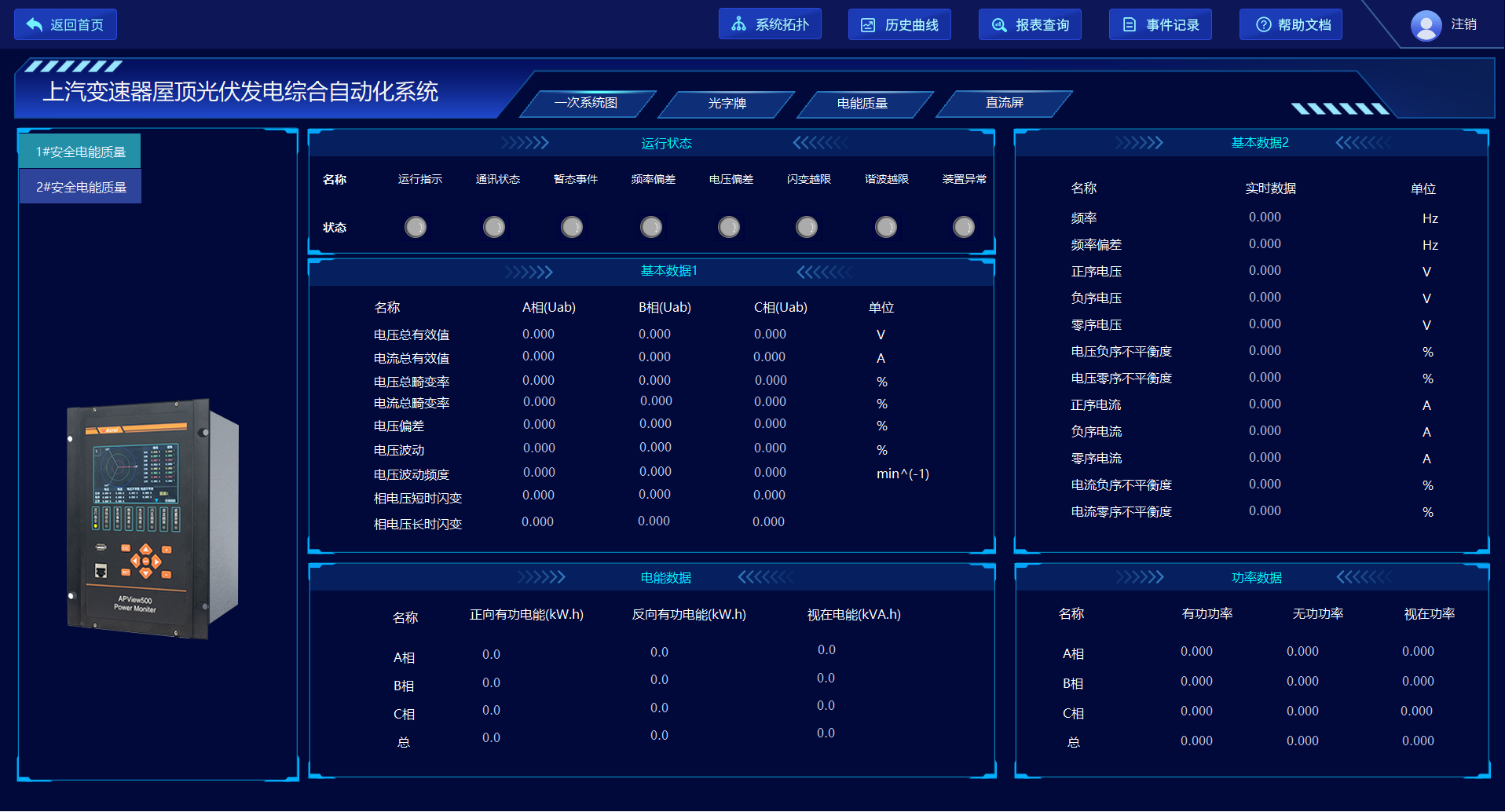 電能質(zhì)量在線監(jiān)測裝置采集#1、2#光伏并網(wǎng)接入點的電能質(zhì)量信息,可以對整個供電系統(tǒng)的電能質(zhì)量包括穩(wěn)態(tài)狀態(tài)和暫態(tài)狀態(tài)進(jìn)行持續(xù)監(jiān)測。系統(tǒng)界面實時顯示裝置通信狀態(tài)、各監(jiān)測點的A/B/C相電壓總畸變率、三相電壓不平衡度百分比和正序/負(fù)序/零序電壓值、三相電流不平衡度百分比和正序/負(fù)序/零序電流值,幫助管理人員實時掌握供電系統(tǒng)電能質(zhì)量情況,以便及時發(fā)現(xiàn)和消除供電不穩(wěn)定因素。