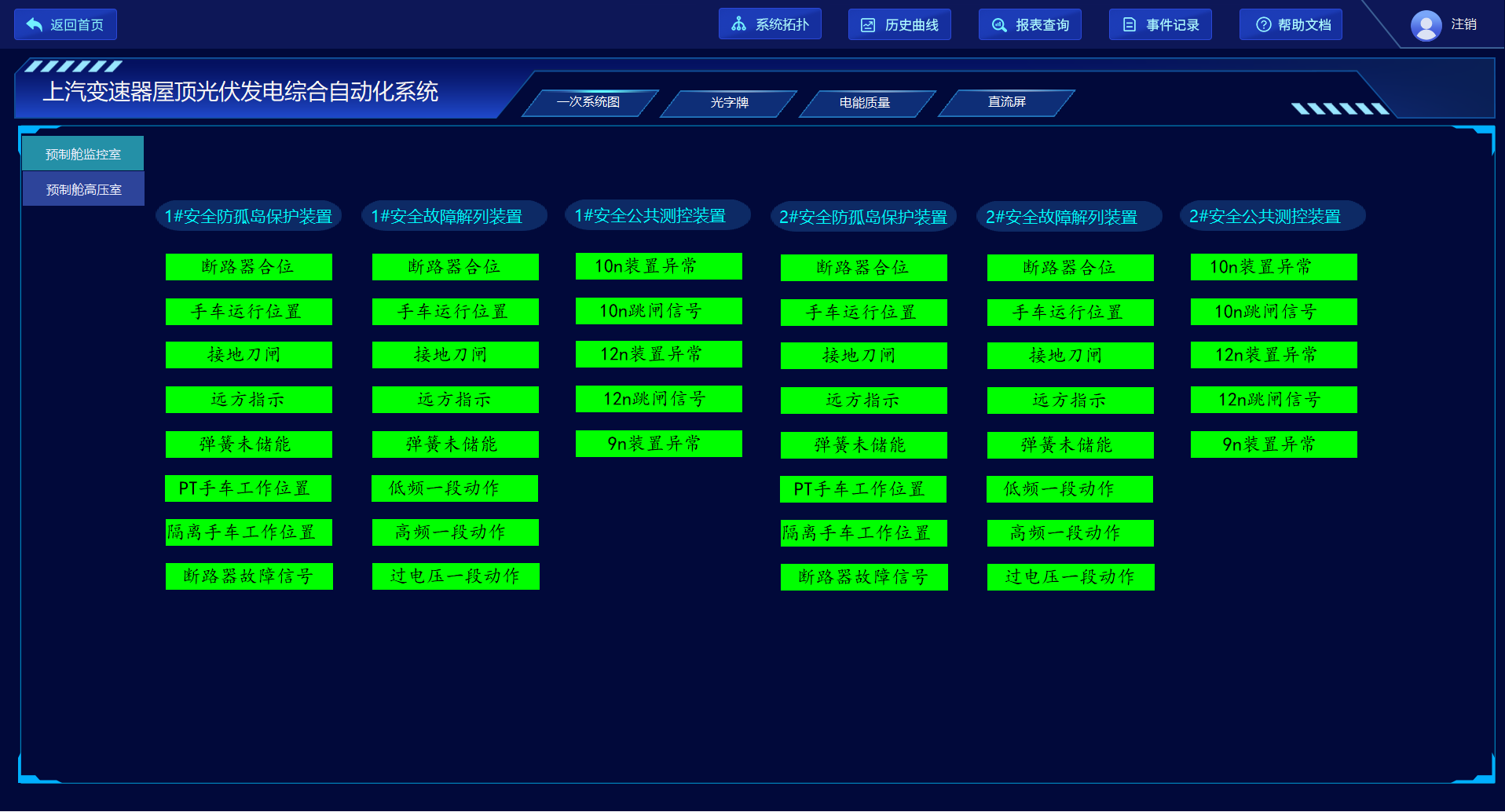 光字牌可以顯示電力系統(tǒng)中設(shè)備的運行狀態(tài)和系統(tǒng)的重要信息,為運行人員提供清晰的狀態(tài)指示和警示信號,包括二次設(shè)備的異常、跳閘信號,開關(guān)柜斷路器的分合位、手車位置、接地刀閘等信號。