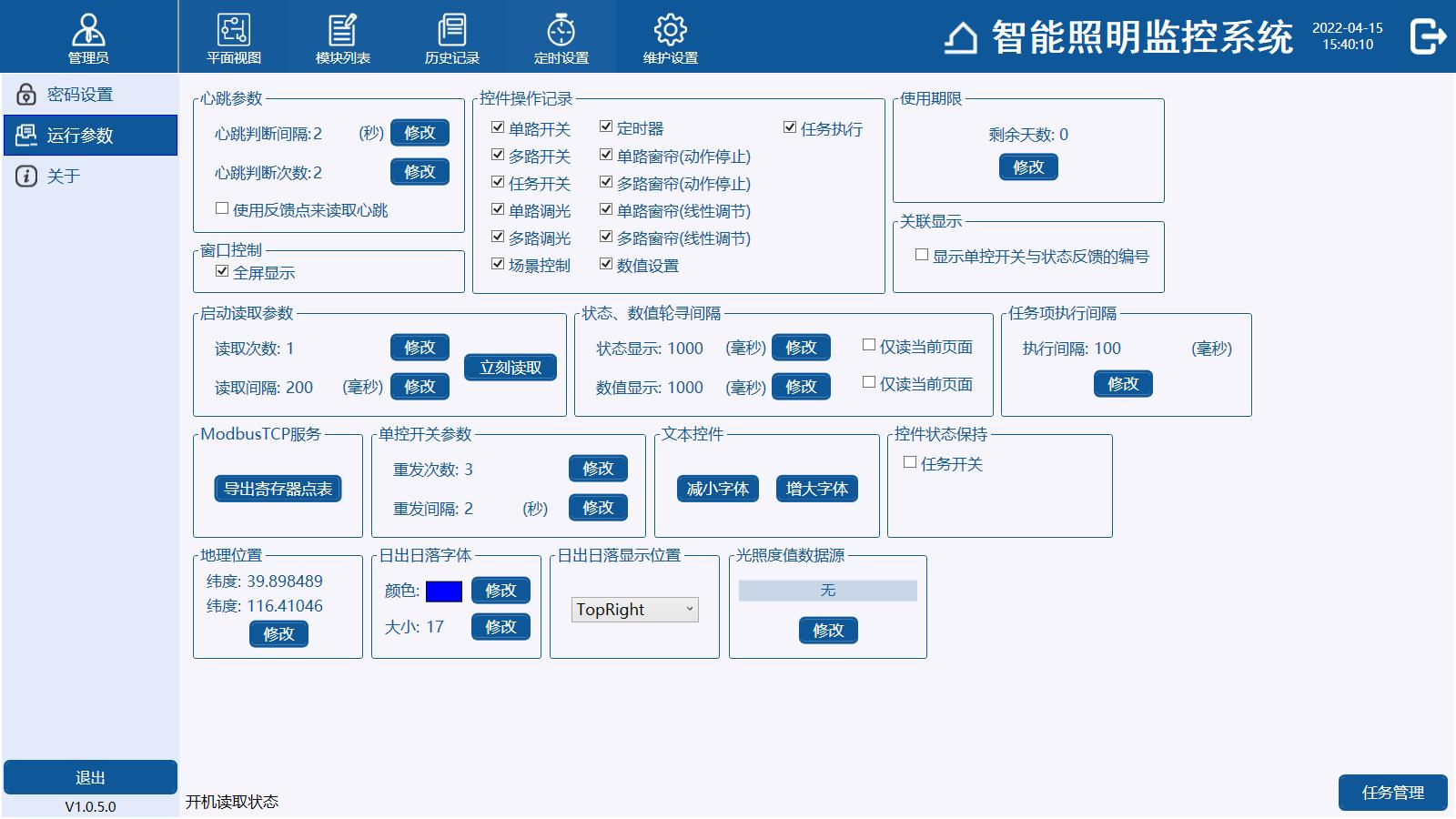 9)系統(tǒng)可以通過預設的當?shù)亟?jīng)緯度信息,自動計算每天的日升日落時間;根據(jù)天文時鐘控制照明開關,實現(xiàn)日落開燈、日出關燈的功能。