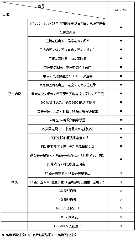 ADW2xx系列導軌式多回路電力儀表主要用于低壓三相回路全電參量測量,同時可選擇四個回路的電流輸入?芍苯踊蜷g接測量電壓、電流、功率、功率因數、相角、不平衡度、諧波等參數。 還可通過其RJ45接口擴展輔助功能,實現DI、DO、測溫、剩余電流測量,以及2G、4G、LoRa、LoRaWan、NB-Lot無線通信功能。