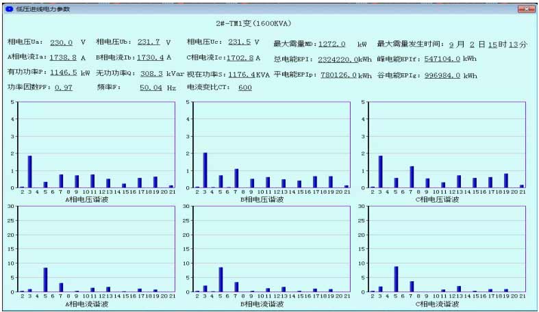 系統可以對整個配電系統范圍內的電能質量進行持續性的監測,運行維護人員可以通過諧波分析棒圖、報表掌握進線、變壓器、重要回路的電壓、電流諧波畸變率、諧波含量、電壓不平衡度等,及時采取相應的措施,降低諧波損耗,減少因諧波造成的異常和事故(該功能需要選配帶諧波監測功能的電力儀表,不需要可刪除。